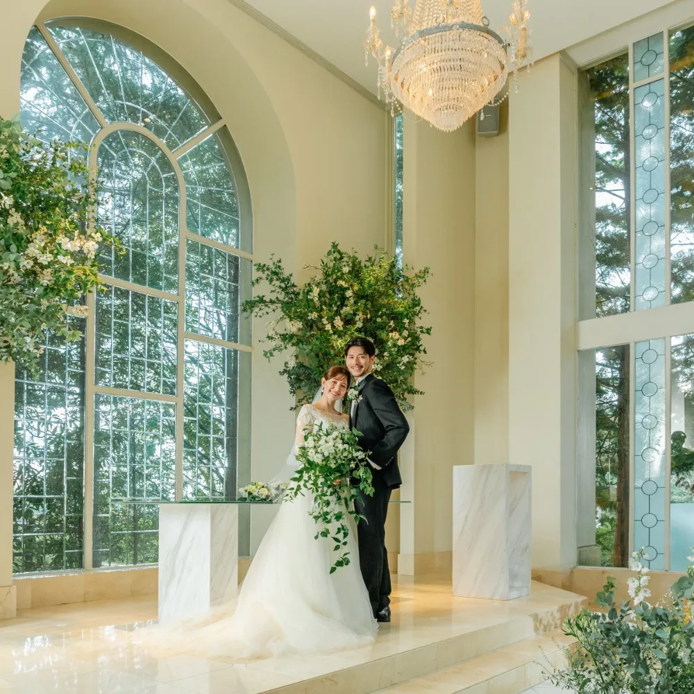 祭壇のガラス越しの木々の緑や温かな陽光に包まれた心地よいチャペルでロマンティックな挙式を。