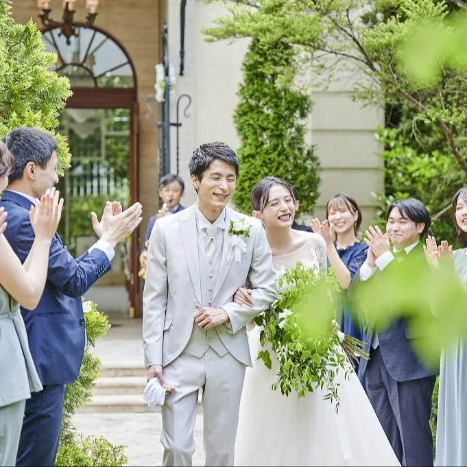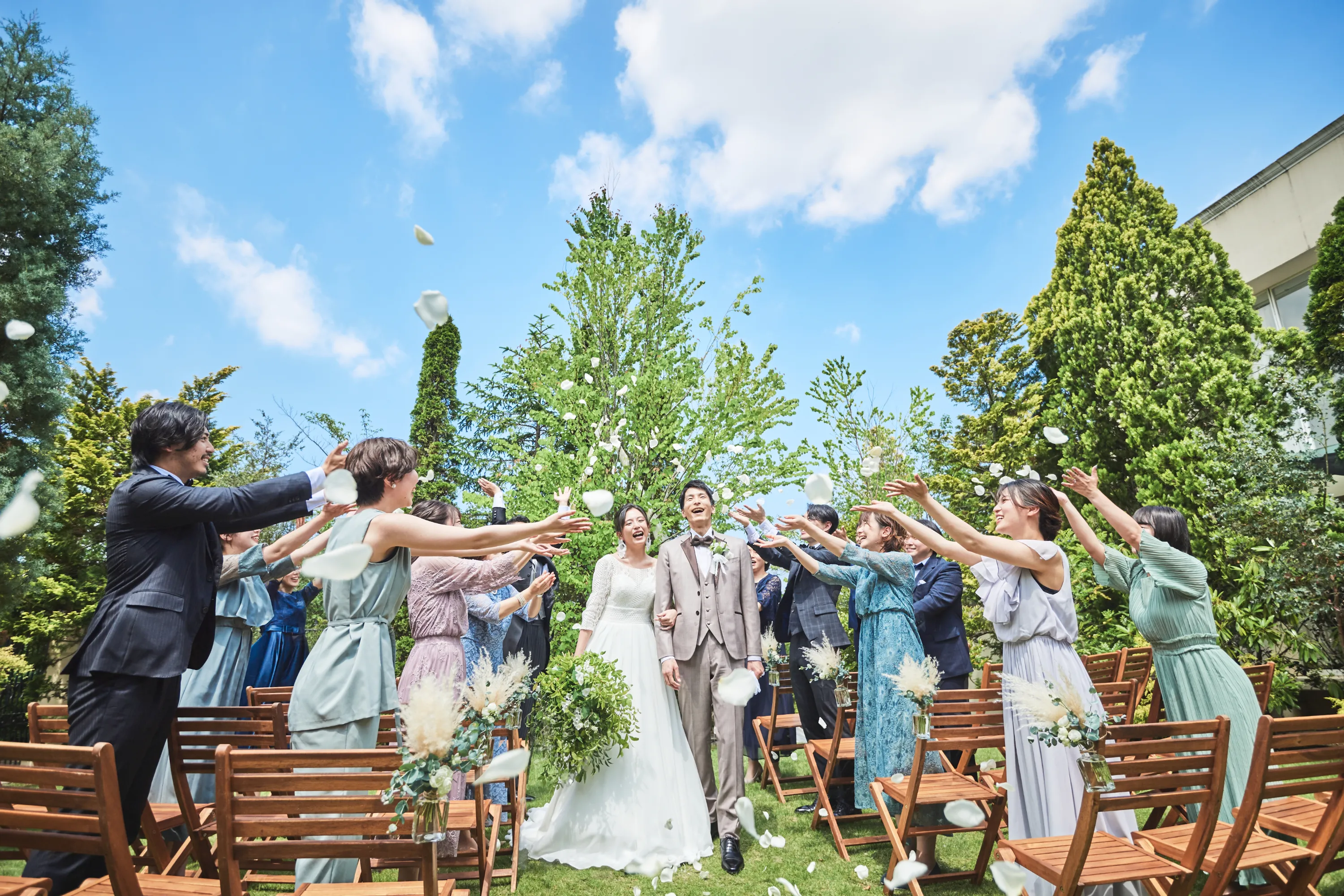 美しいガーデンで開放的な誓いの時間を。青空の下に映えるフラワーシャワーやバルーンリリース・・・