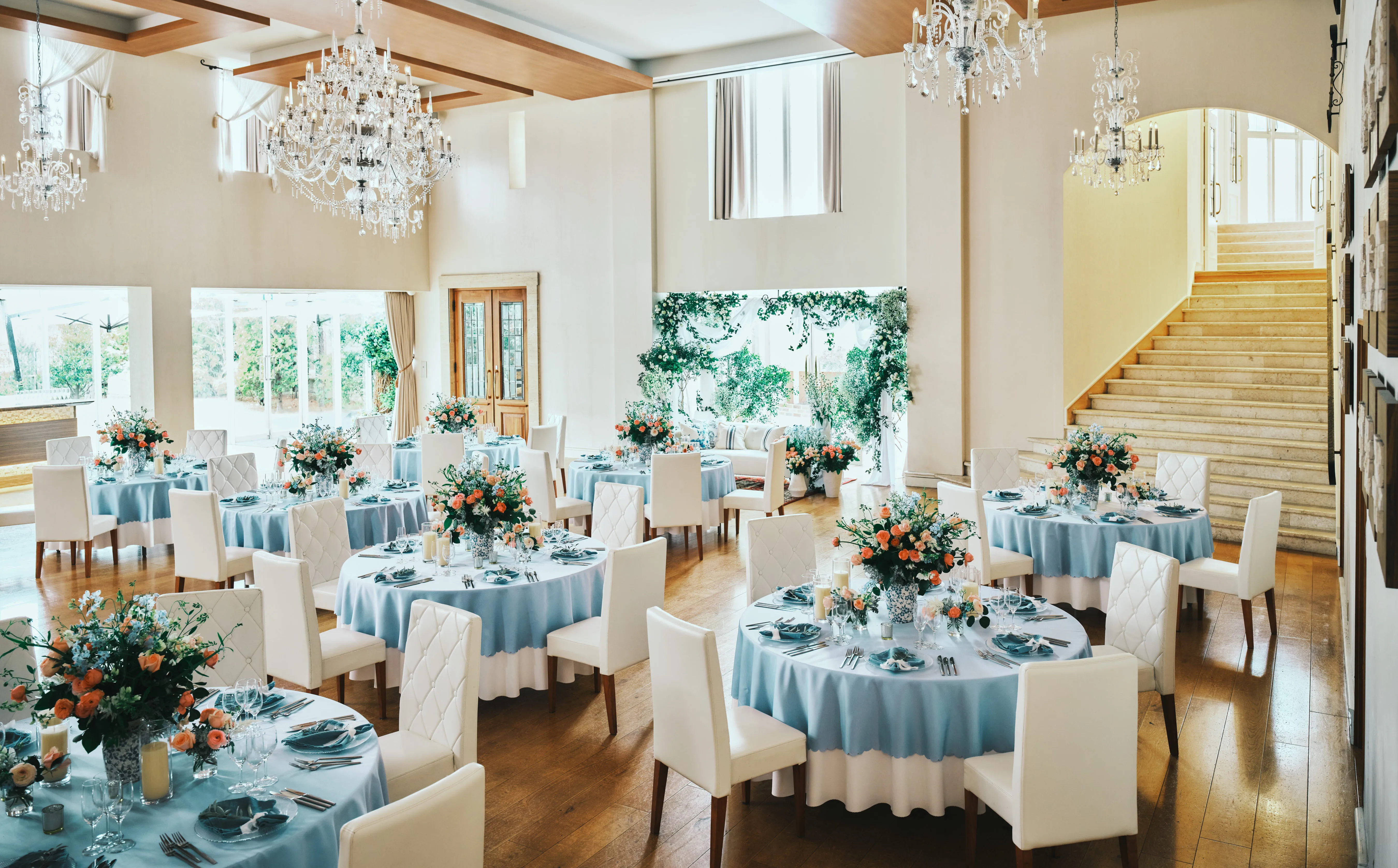 明るい陽光に包まれたパーティ会場は、広いガーデンと一続きの開放的な空間です。おふたりのお好みで自由にコーディネートできます。