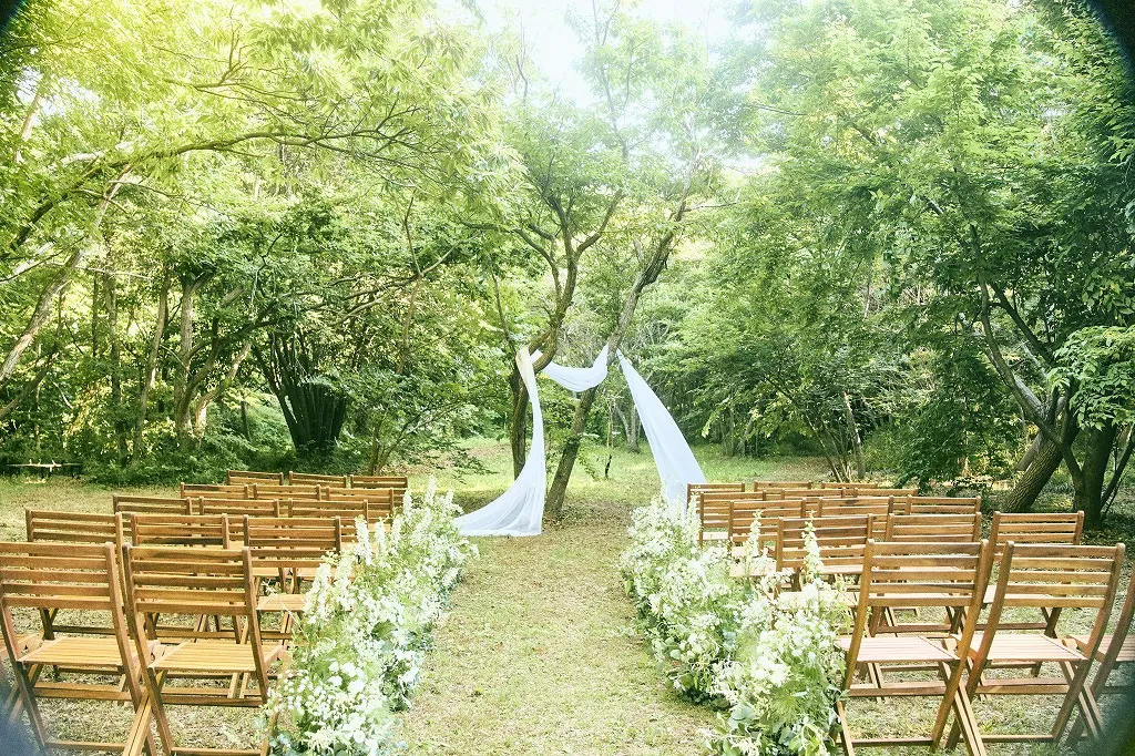 駅がすぐ目の前の好立地。自然豊かな中に佇む英国風の邸宅を貸し切りにしてアットホームな一日を。挙式やパーティ以外の時間もゆったりと過ごせます。