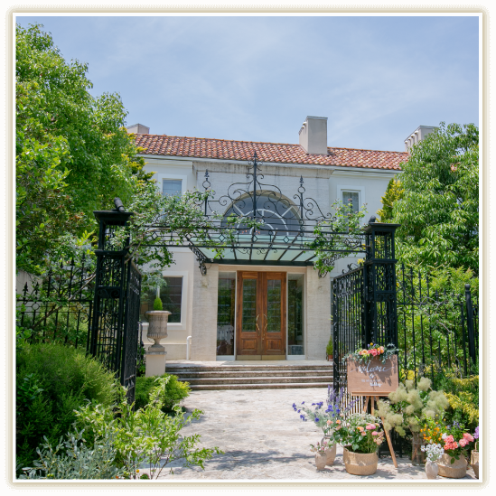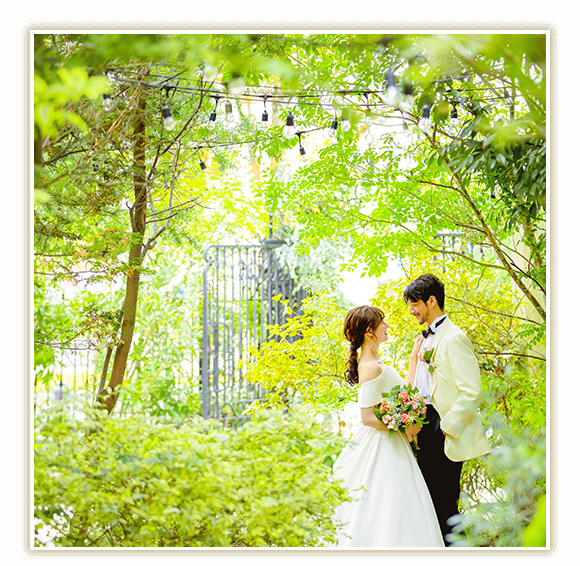 邸宅のお隣にある森の中で、緑あふれる挙式を行うことができます。まるで物語のように美しい、自然の祝福に満ちた特別なセレモニーです。