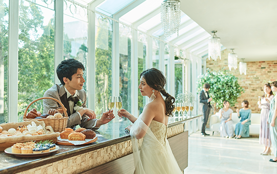 お庭に面した一角にバーカウンターがございます。ゲストに自由にドリンクをとりに来ていただけ、パーティ中に席を立って少し寛いだり、 会話をしたりとリラックスできます。