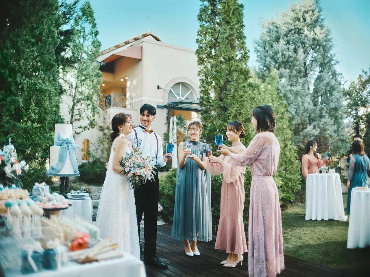 手入れの行き届いた天然芝のガーデンに出て、 自然を感じる自由なパーティを。青空の下、色とりどりのピンチョスやデザートが並ぶと素敵なピクニックのよう。童心に戻ってひたすら楽しむパーティはたくさんの祝福と笑顔が響き合うでしょう。