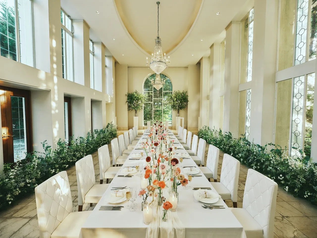 3面の大きな窓から差し込む陽光にシャンデリアが煌めく純白の空間で、ゲストとのつながりを感じられる温かなひと時を。ゲスト全員の顔を見渡すことができるテーブルレイアウトはおもてなし重視のおふたりにもおすすめです。