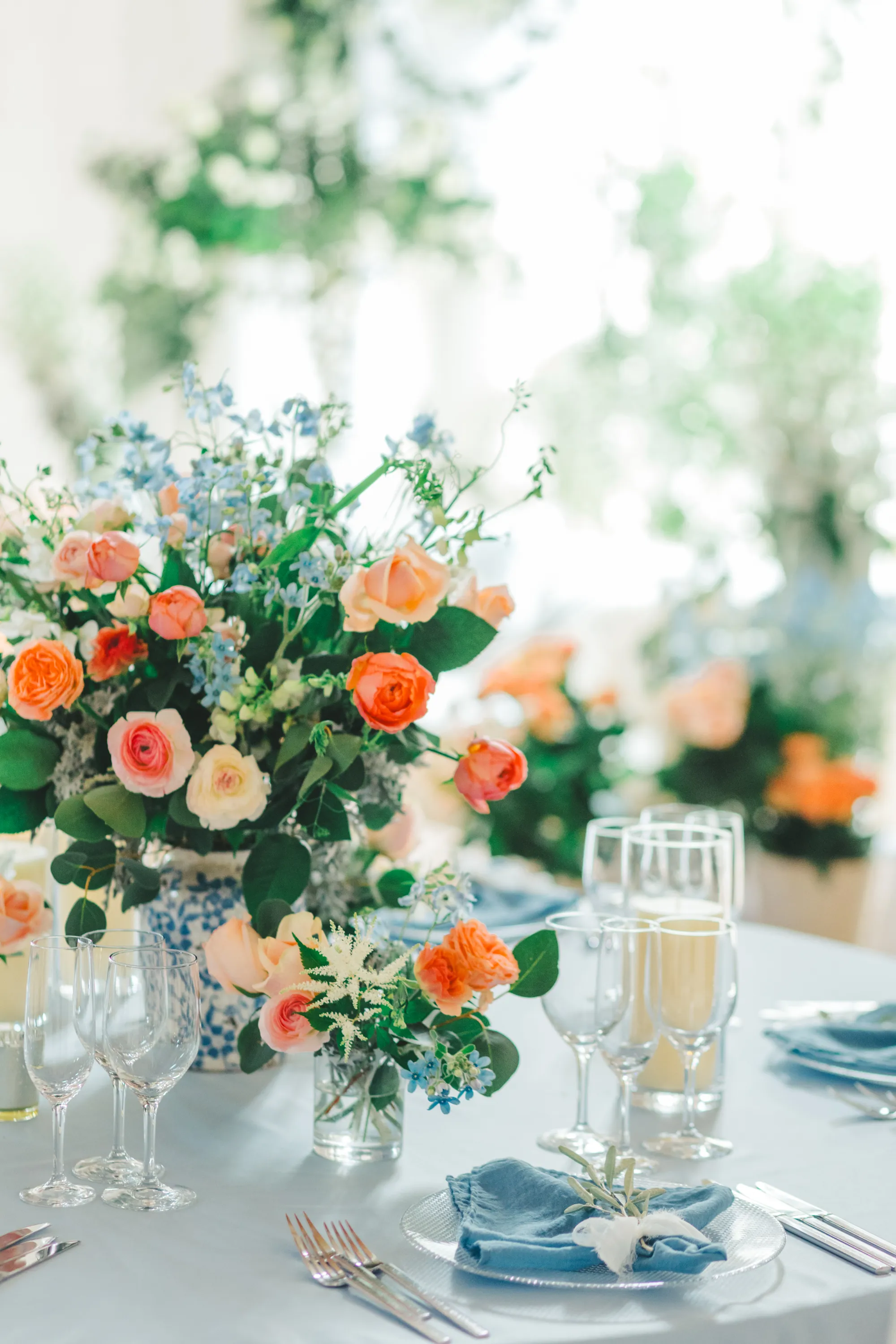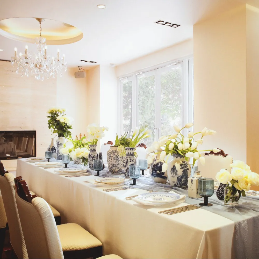 上質な白を基調としたシンプルな空間だから映える、淡いニュアンスカラーのお花やテーブルクロスでコーディネート。甘すぎない上品な大人の可愛らしさを演出します。