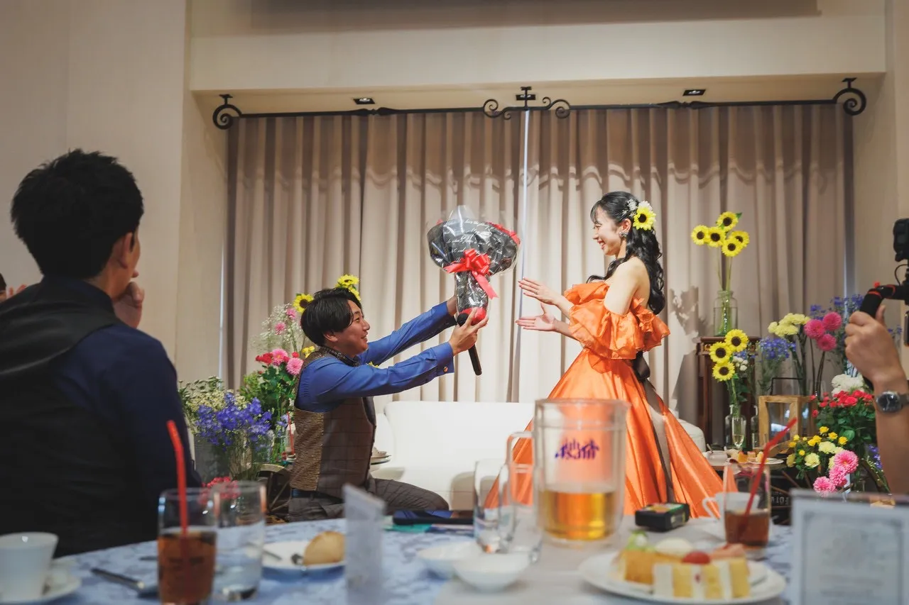 皆様の前で、新婦様への想いをサプライズムービーと花束に込めて伝えてくださいました