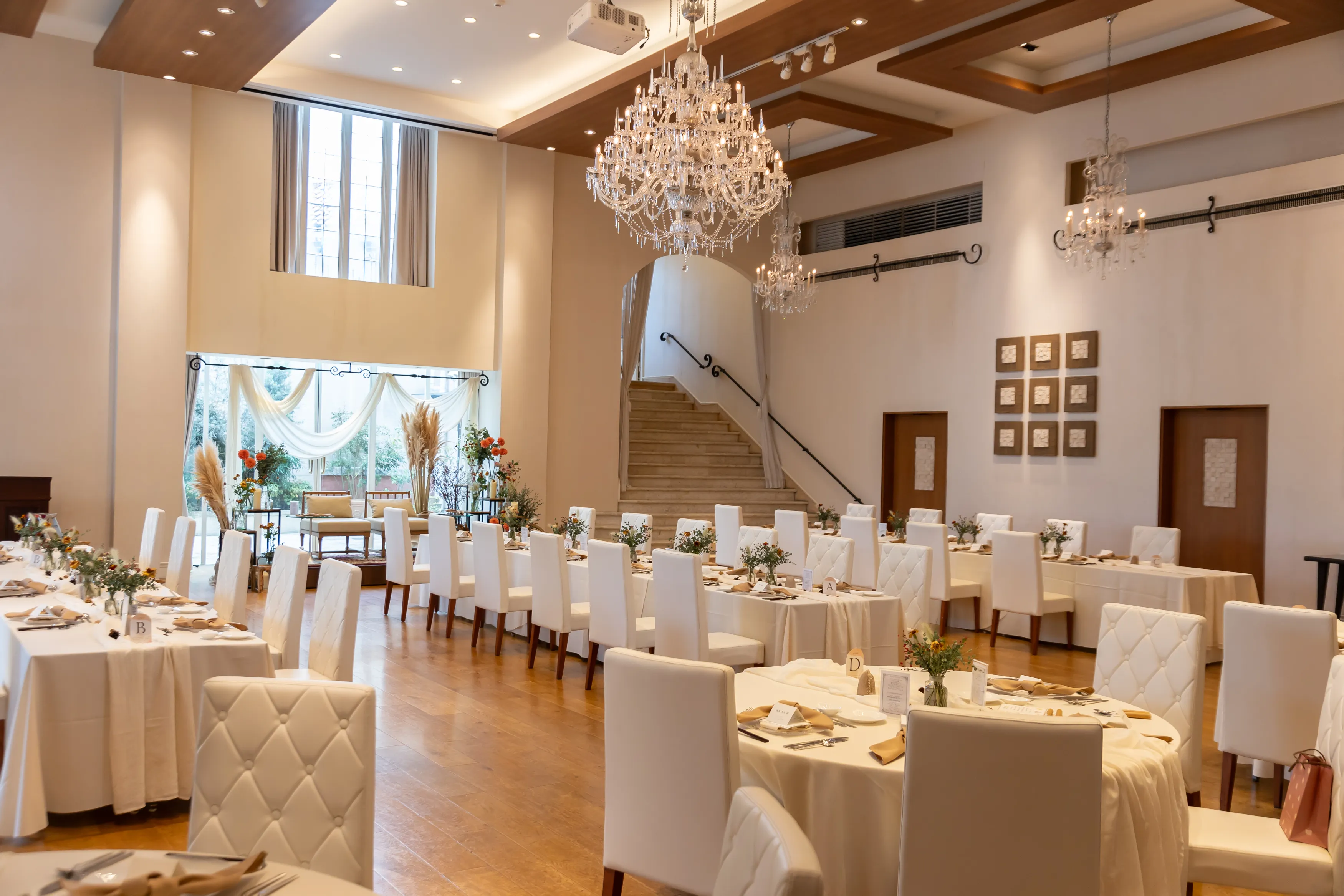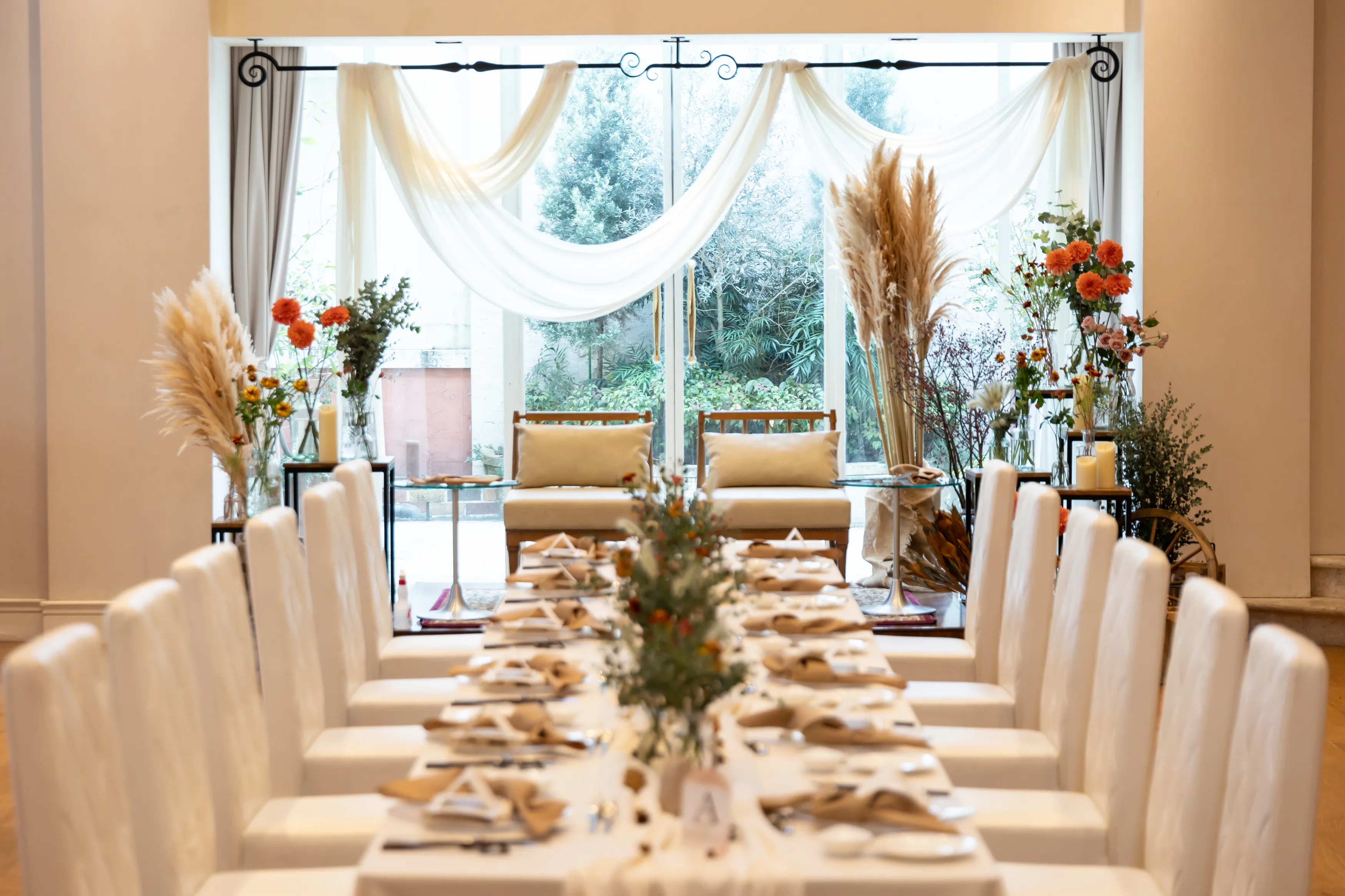 ゲスト全員がリラックスして楽しめるよう、長卓と円卓をMIXさせたコーディネートに*゜