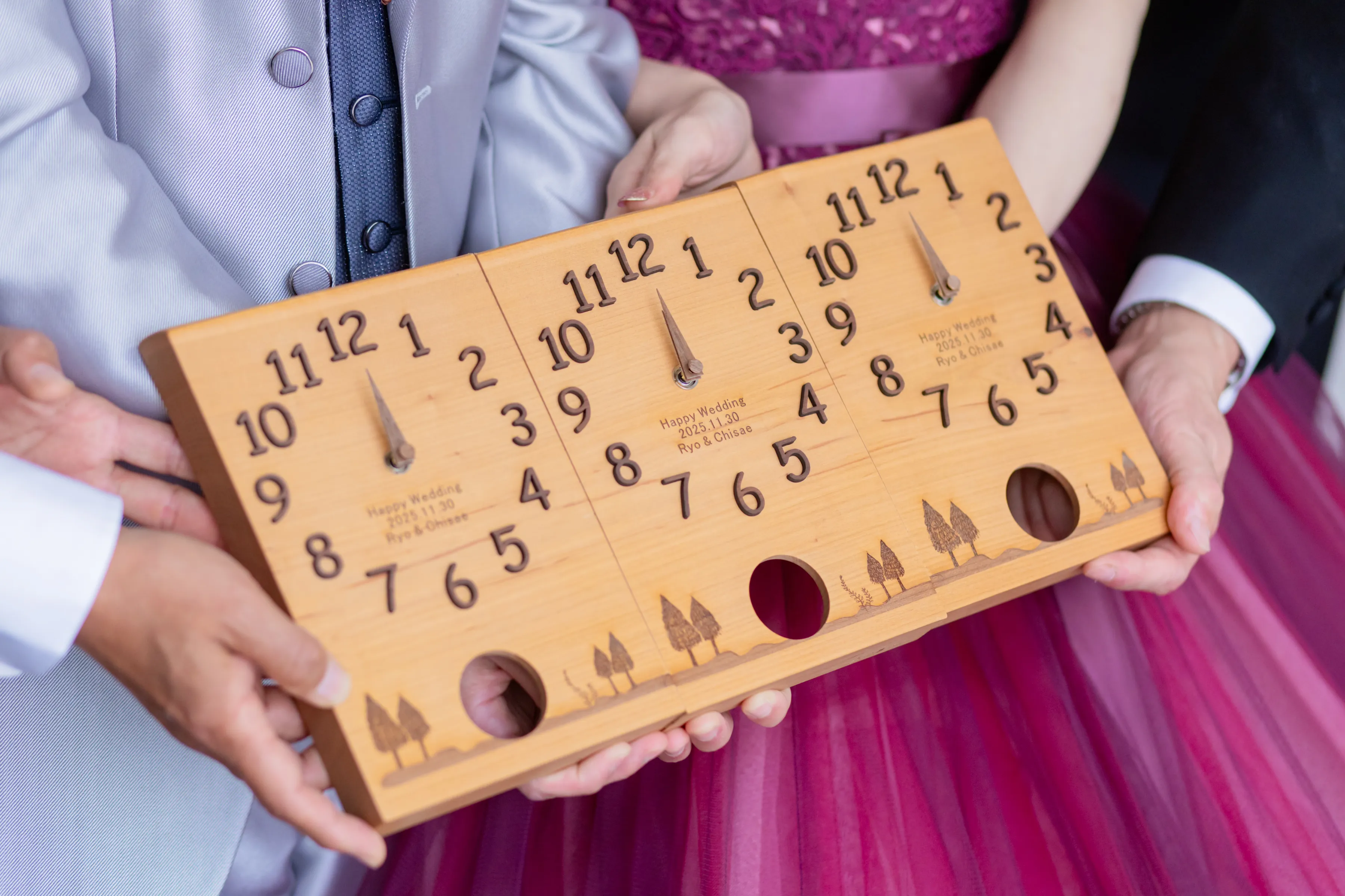 またご姉妹には3連時計の木材を使用した